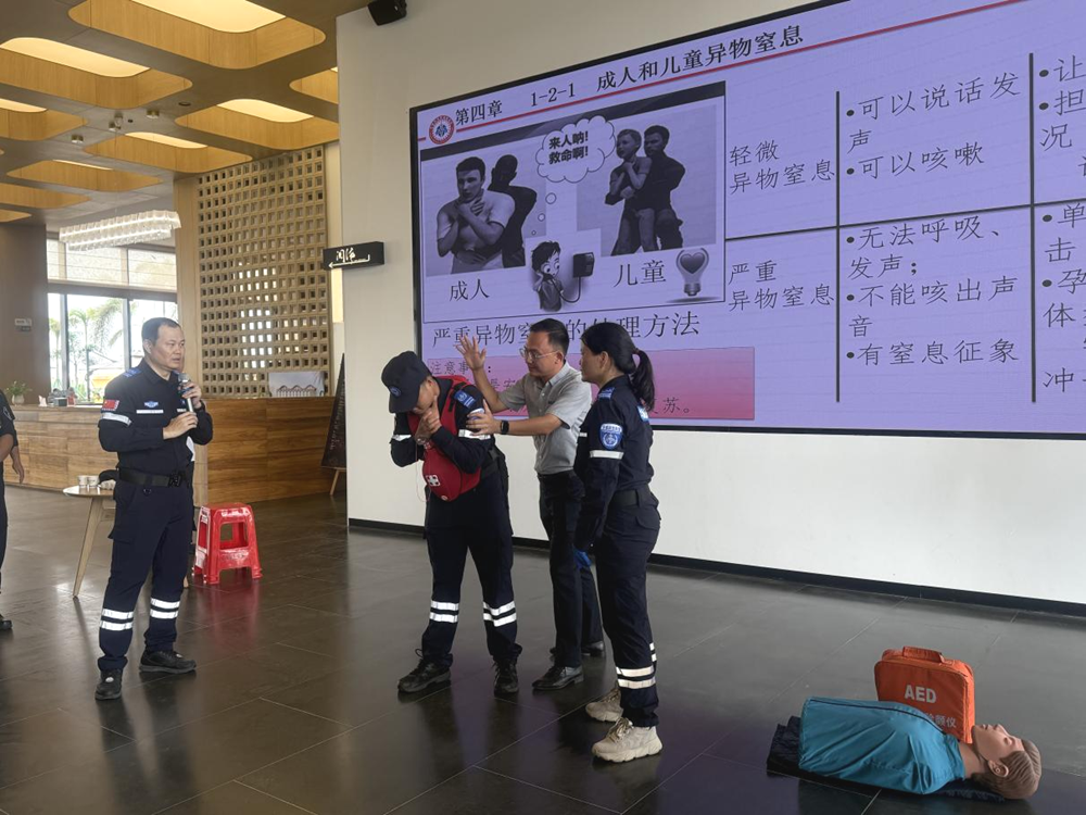 海姆利克急救法是應對氣道異物梗阻的有效方法。教練員通過生動的模擬裝備講解和現場演示,讓員工們深刻認識到氣道異物梗阻的危險性,并詳細介紹了海姆利克急救法的操作要點,包括站位、手法、力度等。員工們在模擬練習中,互相配合,反復練習,確保能夠熟練掌握這一急救技能。