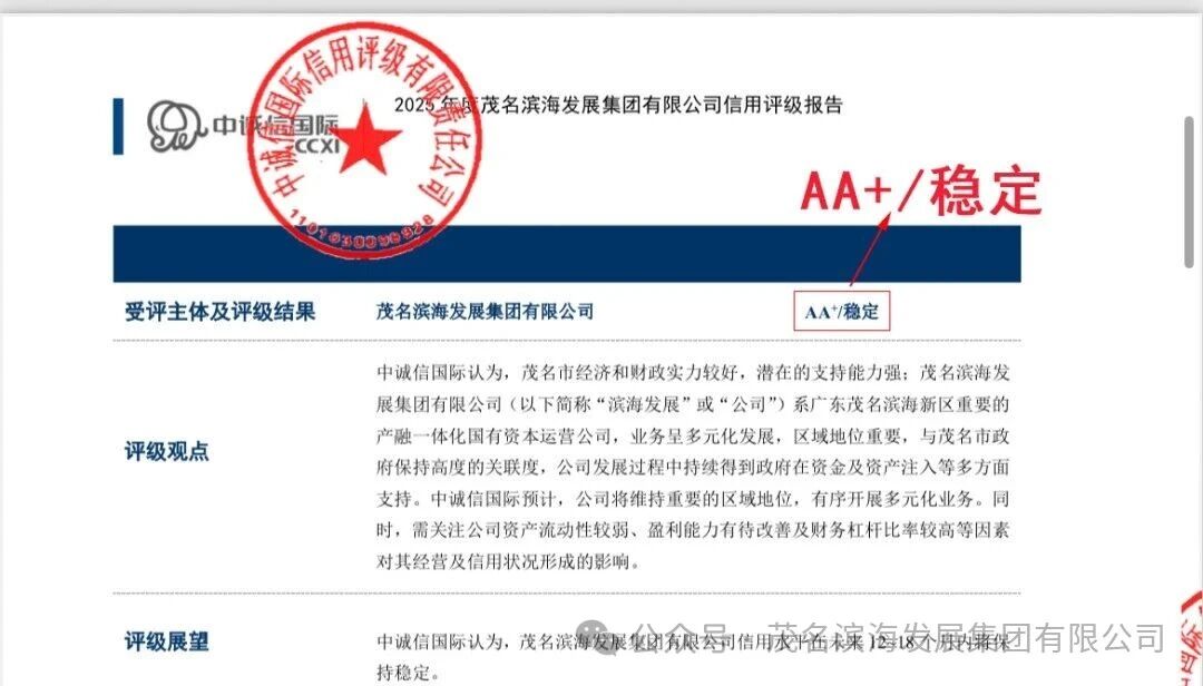 2025年9月30日,茂名濱海發(fā)展集團(tuán)有限公司(以下簡稱“濱海發(fā)展集團(tuán)”)迎來發(fā)展史上的重要里程碑——國內(nèi)權(quán)威信用評(píng)級(jí)機(jī)構(gòu)中誠信國際信用評(píng)級(jí)有限責(zé)任公司正式發(fā)布評(píng)級(jí)報(bào)告,評(píng)定集團(tuán)主體信用等級(jí)為AA+,評(píng)級(jí)展望為“穩(wěn)定”。