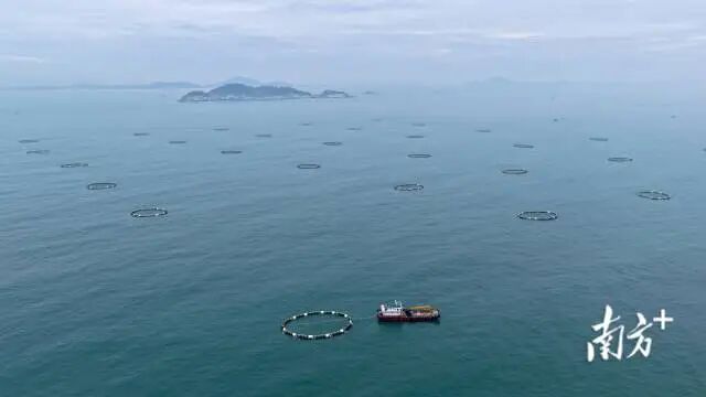 從茂名吉達港區東華能源重件碼頭起航,搭乘養殖運輸船,約1個小時就能抵達茂名大竹洲海洋牧場養殖區。從高空俯瞰,數十個深水網箱排列在海面,蔚為壯觀。